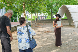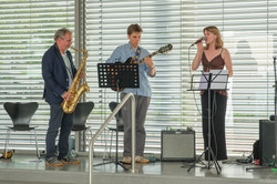 Im Anschluss an den offiziellen Teil lud die Fakultät zu einem Empfang mit Getränken und Snacks im Freien ein. Die sommerliche Kulisse rund um den Natursteinpavillon bot Raum für Gespräche, Begegnungen und viele persönliche Erinnerungsfotos. Das Jazz-Trio sorgte auch hier mit weiteren Stücken für musikalische Umrahmung.
