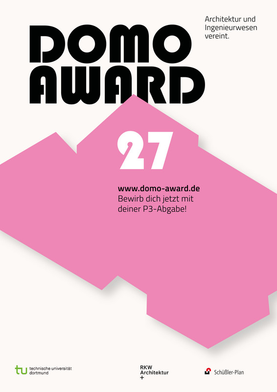 In cooperation with the Faculty of Architecture and Civil Engineering at TU Dortmund University, RKW Architektur + and Schüßler-Plan will be jointly presenting the Domo Award from 2024. Every year, the award honours students who have excelled in their Master's degree course as part of the "P3, Civil Engineering Structures" module, both through particularly good technical work and team-oriented working methods. The award recognizes students within the framework of the Dortmund model. This promotes the interdisciplinary training concept at TU Dortmund University in a way that is unique in Germany. The "P3" is the last project of the course to be worked on jointly by architecture and civil engineering students. It can therefore be seen as the culmination of the intellectual and constructive debate within the Dortmunder Modell. The prize money of €2,000 each is earmarked for a specific purpose and supports students in carrying out a subject-related study trip. The application phase for the Domo Award will begin in spring 2024. Further information about the process and the application will be published shortly.